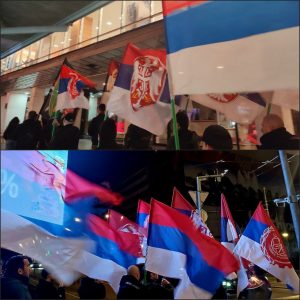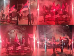 Таква мисао је мотив нашег транспарента где су међ’ нашим знамењем и под светлошћу бакљи, либерализам и демократија сликовито представљени у виду агресорских бомби.