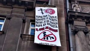 Мeђутим, током трајања наказне шетње, развијен је транспарент припремљен од стране наших активиста, а на којем је уз наш знамен и часни крст, исписана порука упућена учесницима наказног дефилеа, као и њиховим режимским покровитељима који пљачкају народ, издају Косово и Метохију и спроводе антинародну политику. Медији су убрзо пренели вест о овој нашој „провокацији“, а фотографија нашег транспарента који је иначе развијен са једног од прозора под којим су изопачењаци дефиловали, заједно са својом идеолошком сабраћом и заштитницима из садашње и бивше власти, уклоњена је са наше Фејсбук странице од стране администрације Фејсбука.