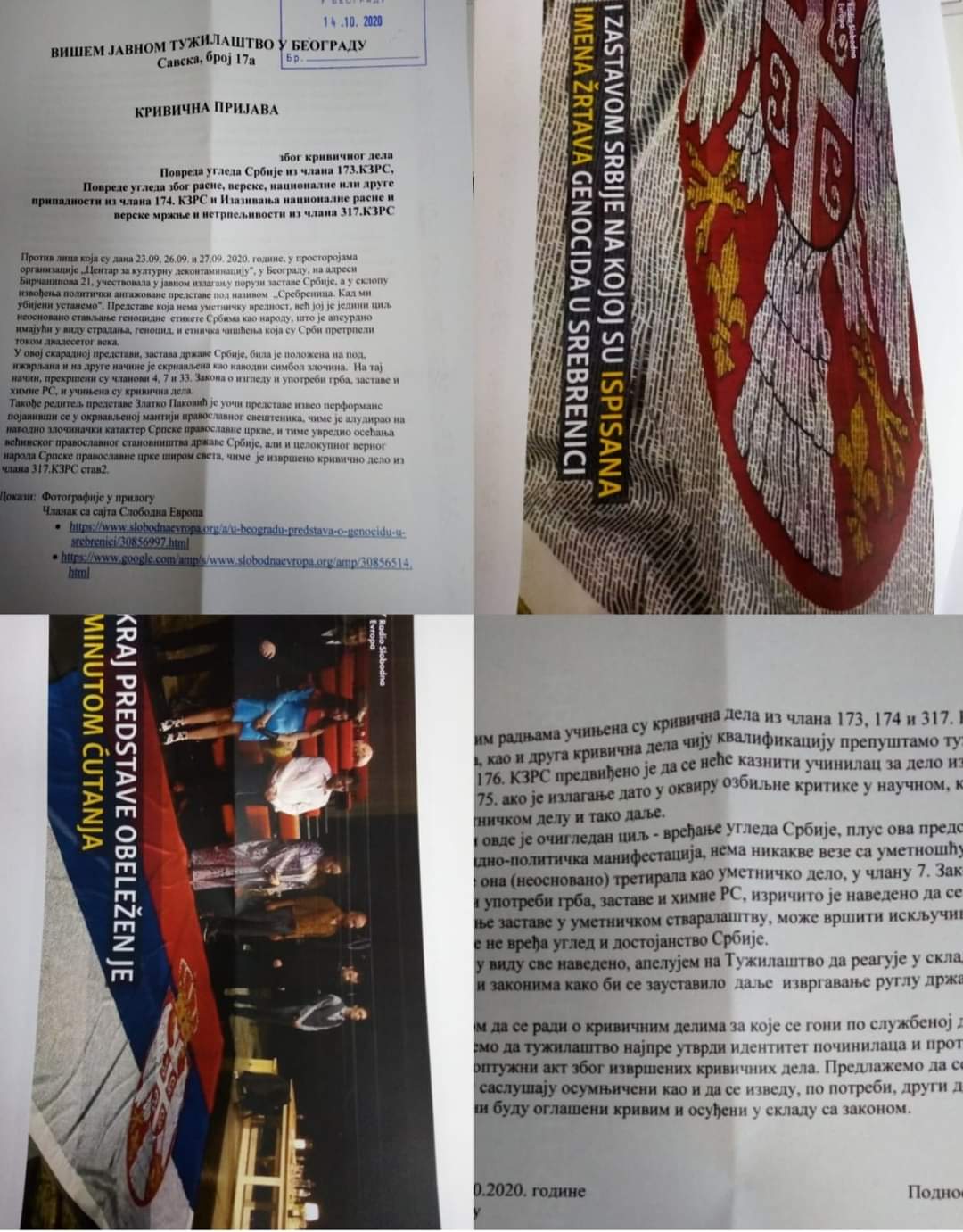Србска Акција поднела је кривичну пријаву против лица која су дана 23.9, 26.9. и 27.9. 2020.године, у просторојама србомрзачке организације „Центар за културну деконтаминацију“, у Београду, учествовали у испољавању мржње према србском народу и јавном излагању порузи заставе Србије, а у склопу извођења политички ангажоване антисрбске представе под називом „Сребреница. Кад ми убијени устанемо“. Представе која нема уметничку вредност, већ јој је једини циљ неосновано стављање геноцидне етикете србском народу.