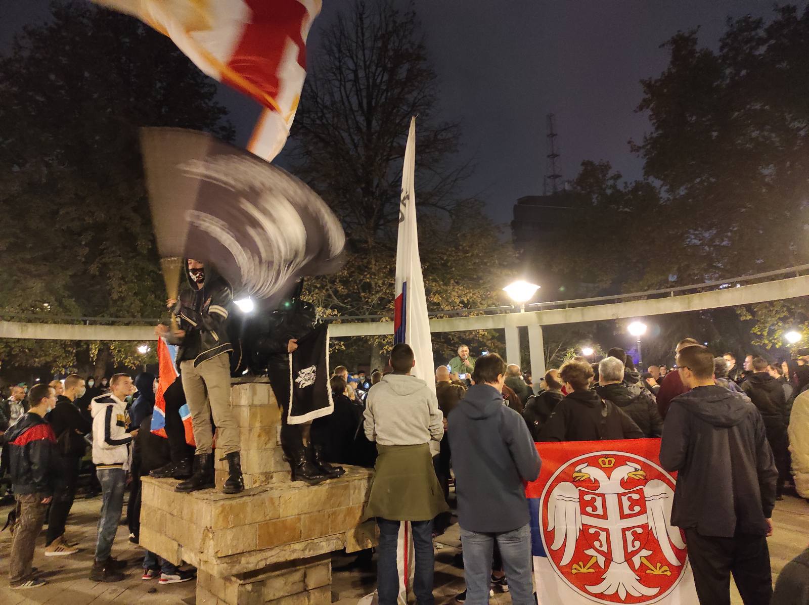 Овом протесту, покушала је да опонира група псеудолевичарских пропалица уз помоћ полиције, која уместо да приведе правди учеснике тог непријављеног скупа, штити тај антисрбски провокаторски шљам. То наравно није ништа ново, већ је честа појава већ деценију, и током многих наших активности. И то је логично јер ови црвени кловнови подржавају све битне чиниоце мондијалистичке окупације Србије, као што су: антихришћанство, србофобија, најезда миграната или промоција изопачењаштва. Зато су и ти самозвани антифашисти (заправо, нерадници, наркомани и вечити студенти) – обичан делић капиталистичког и мондијалистичког система антисрбске окупације.