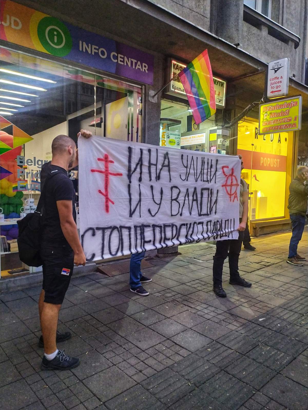 Наши активисти су развили транспарент испред ,,Прајд инфо центра’’ надомак Андрићевог венца, са поруком – ,,И на улици, и у Влади, стоп педерској паради!’’