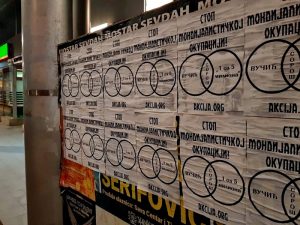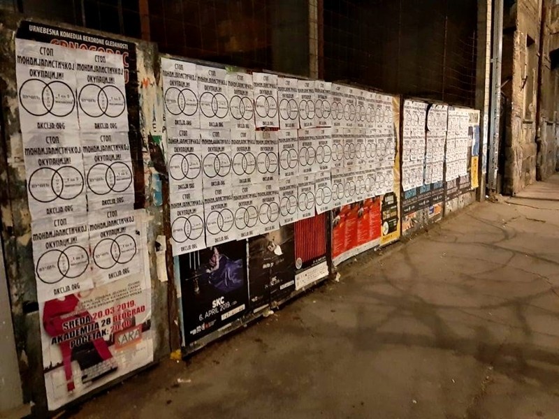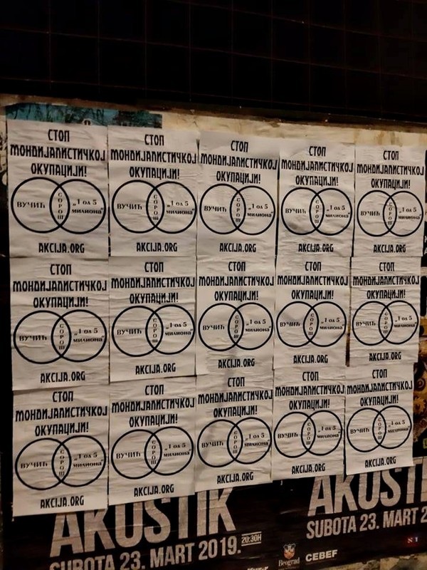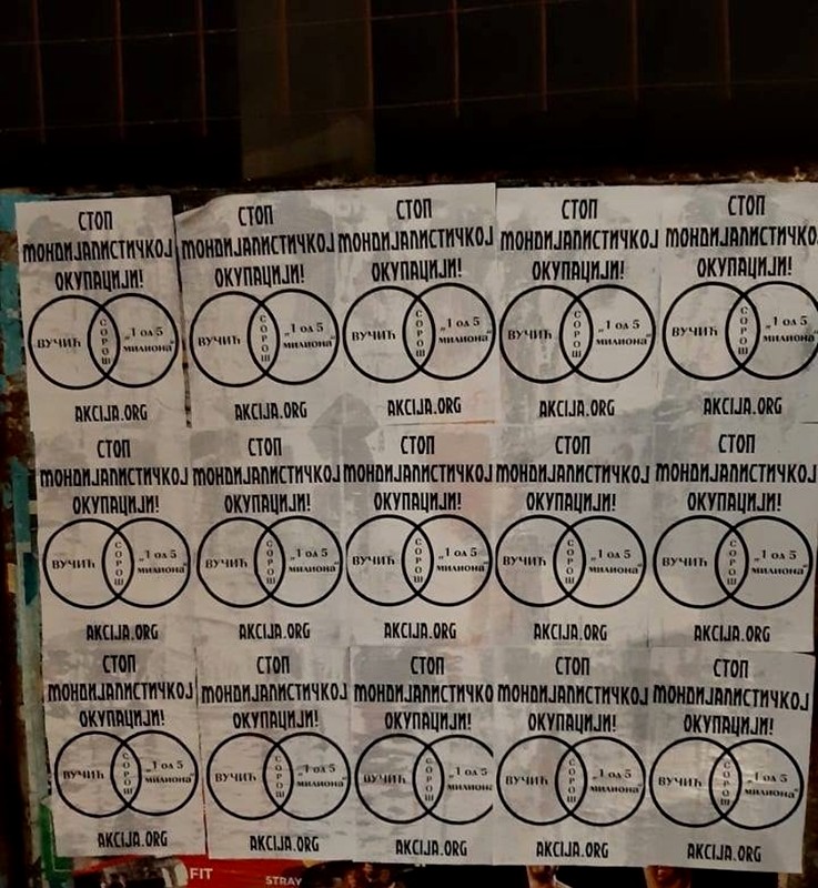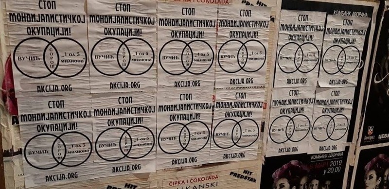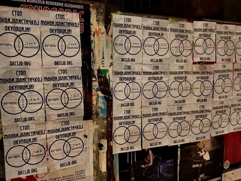 Активисти Србске Акције започели су акцију лепљења плаката са поруком „Стоп мондијалисточкој окупацији“ и одговарајућим приказом који указује на истиврсност издајничке Вучићеве власти и издајничке опозиције. Исте оне која под паролом „1 од 5 милиона“, спроводи своје делатности против власти, али не и против система мондијалистичке окупације Србије.