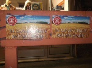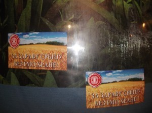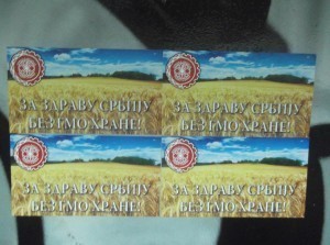 Свесни опасности које генетски модификована храна носи са собом, активисти Србске Акције налепницама и слоганом „За здраву Србију без ГМО хране!“, дају свој допринос подизању свести србског народа о важности борбе против овог зла модерног доба, а зарад здравља србске деце и србске нацијe.